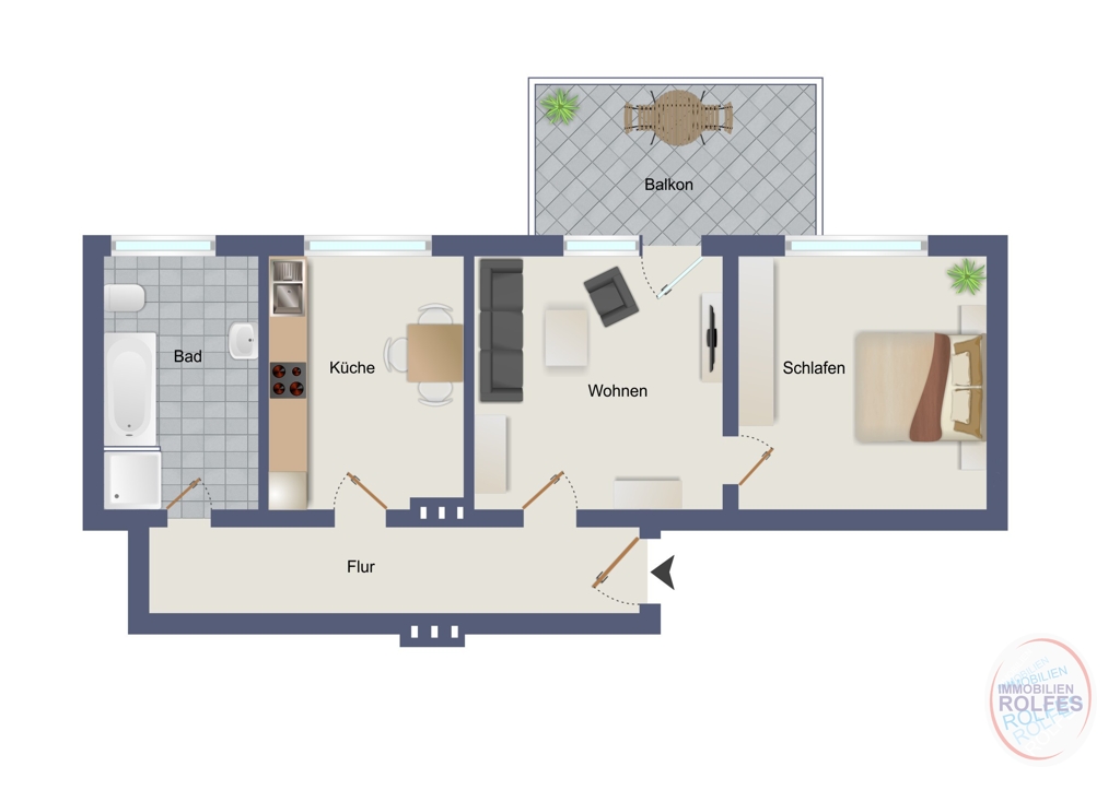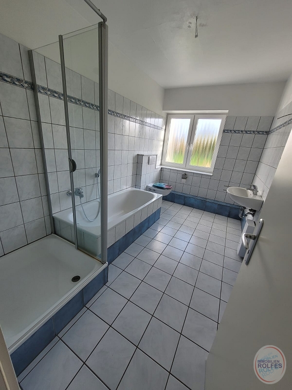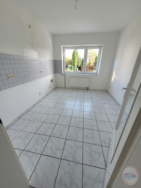 Die Wohnung im Erdgeschoss besteht aus Wohnzimmer, Schlafzimmer, Küche, Diele und einem Dusch- und Wannenbad. Ebenfalls gehört zu der Wohnung ein massiv gebauter Kellerraum mit Fenster sowie ein PKW-Stellplatz. Die Böden im Flur, Bad und Küche sind gefliest, Wohnzimmer und Schlafzimmer in Holzbelag. Die Fenster sind doppelverglast in weißen Kunststoffrahmen. Der große Garten steht den Bewohnern im Allgemeineigentum zur Verfügung.Lage