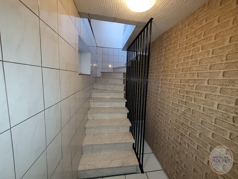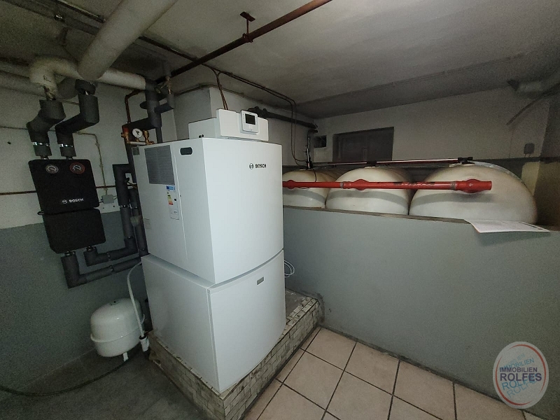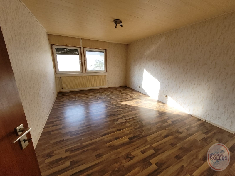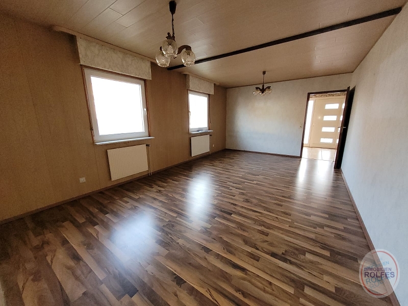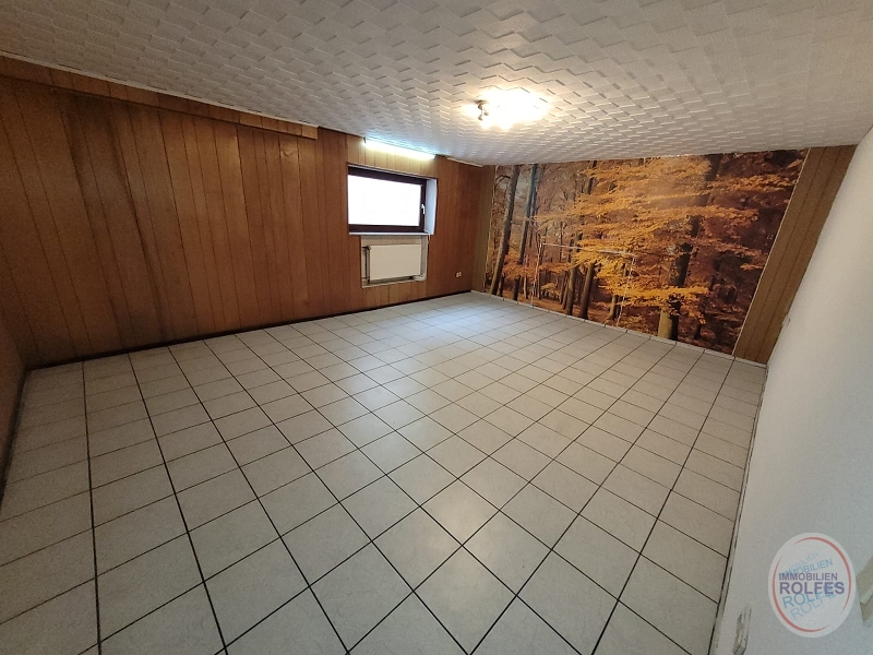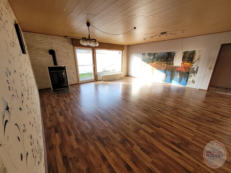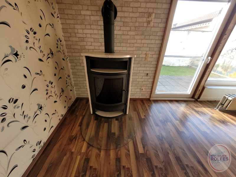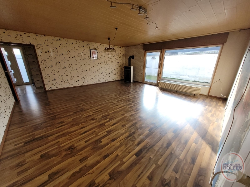 Wohnebene im Erdgeschoss: Wohnzimmer (ca. 37 m²) mit Ausgang zur Terrasse und Garten, Kaminofen (Einbau 2014 für 4000,-€), Schlafzimmer, 3 Kinderzimmer, Küche, Dusch- und Wannenbad, Gäste-WC Kellergeschoss: Waschküche mit Kelleraußentreppe, Hobbyraum, Vorratsraum, Heizungsraum Die Ölzentralheizung mit Warmwasserbereitung wurde 2022 erneuert (Fa. Reinartz 10.600,- €). Die weißen Kunststofffenster mit Isolierverglasung und Rollläden (tw. elektrisch) wurden 2001 erneuert. Die Böden sind mit Fliesen oder Laminat belegt.Lage
