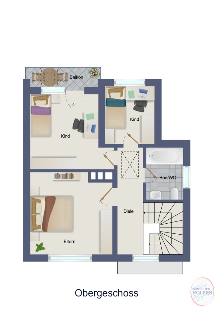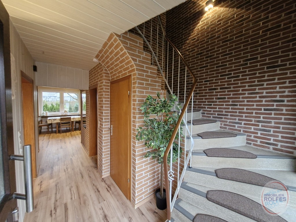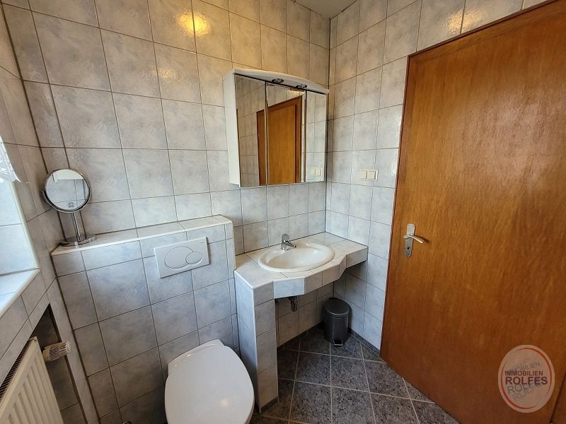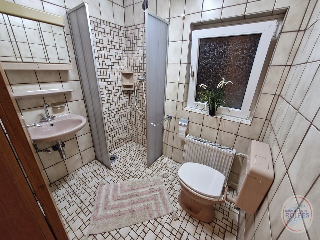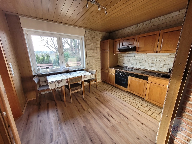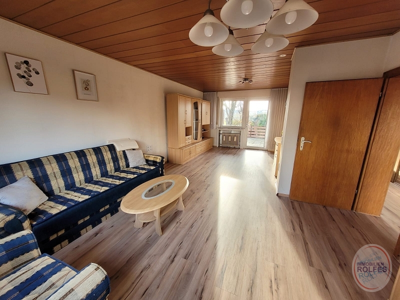 Erdgeschoss: Wohn-Essbereich mit Zugang zur Terrasse, Küche, Diele mit Gäste-WC und Dusche Obergeschoss: Schlafzimmer, 2 Kinderzimmer, Wannenbad Dachgeschoss: Abstellfläche, Hobby Kellergeschoss: Abstellraum, Waschküche mit Kelleraußentreppe zum Garten, Heizungsraum Das Haus wird mit einer Ölzentralheizung mit Warmwasserbereitung beheizt, die 1987neu eingebaut wurde zusätzlich kann das Warmwasser über Durchlauferhitzer bereitet werden. Die außen braunen und innen weißen weißen Kunststofffenster mit Rollläden wurden 1989 erneuert. Die Böden sind mit Laminat oder Teppichböden belegt.Lage